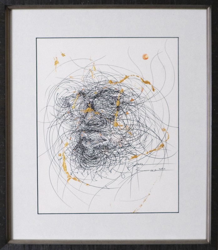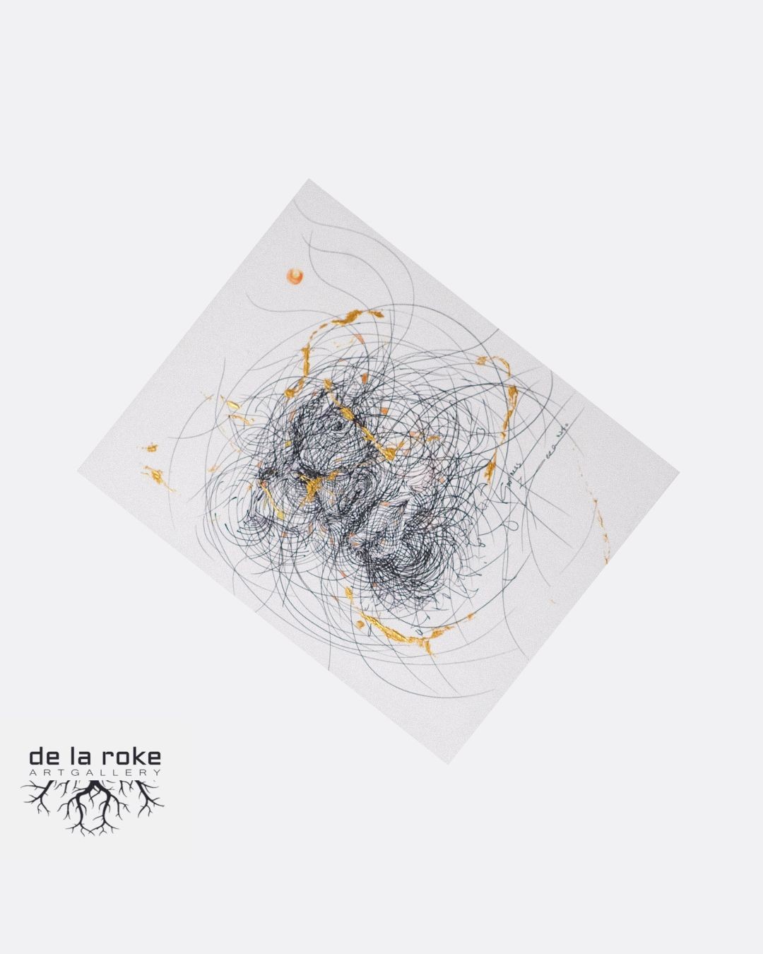 This is an intricate exploration of form and abstraction, using a dynamic interplay of swirling lines and sporadic golden accents. The piece evokes a sense of both chaos and structure, as the loose, overlapping lines come together to form a faint yet discernible portrait. Nnabeze’s use of minimalism, relying primarily on pen strokes and subtle dashes of color, creates a delicate balance between disorder and clarity, inviting the viewer to reflect on the process of creation and the complexity of perception.